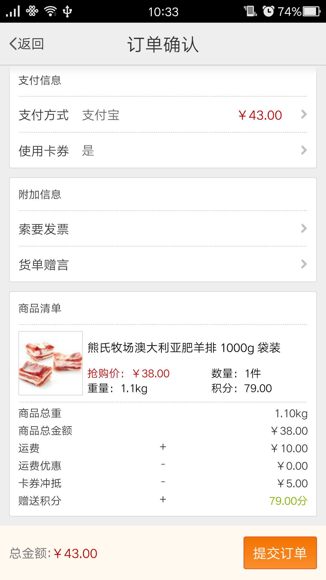 中粮我买网1kg/袋报价38元,相比上次推荐的价格又有小降,但是可以领取我站5元手机的中粮优惠券叠加使用(当然如果不想移动端购买,3元的网站优惠券也是可以用的),中粮有10元运费建议凑单带回,需要注意的是,从网友评价来看,这款肥羊排,少有羊膻味不过也确实很肥,所以建议采用烤制的方法食用,接受不了的网友慎入。