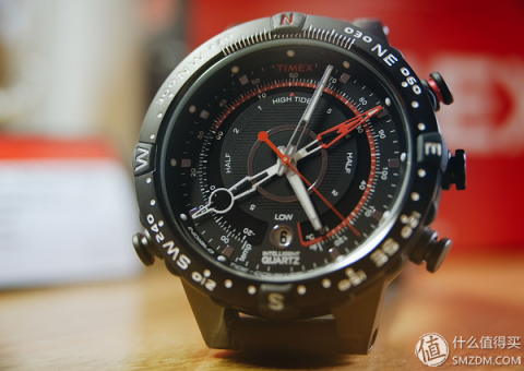 这块T2N720DH男表功能颇为丰富,看起来也够霸气。具体来讲,这款除了计时以外,还具备日历、潮汐、温度计、指南针(数字罗盘)功能,Timex专利的Indiglo全盘均匀背光,夜间观看清晰舒适。6点钟日历显示,耐腐蚀树脂表带,为运动而设计,黑色离子镀不锈钢表壳,防刮耐磨矿物质表镜,表盘直径42mm,厚度13mm,防水100米。